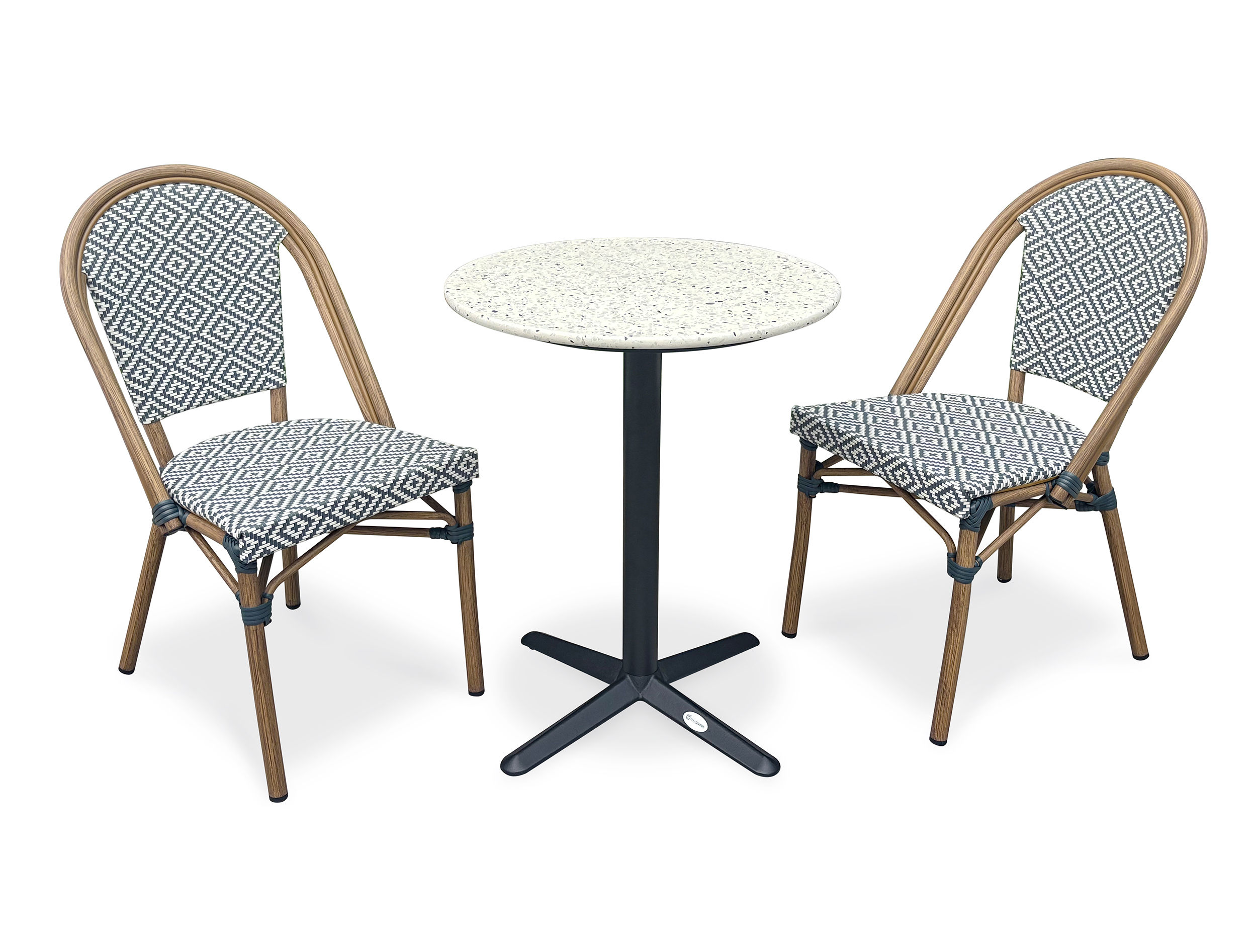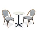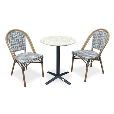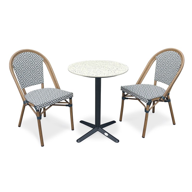 Ensemble repas de jardin BISTRO composé d'une table ronde en acier noir et plateau terrazzo, et de 2 fauteuils de jardin empilables, en aluminium effet bois et textilène de couleur bleu et blanc.