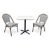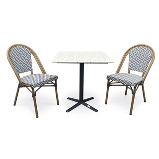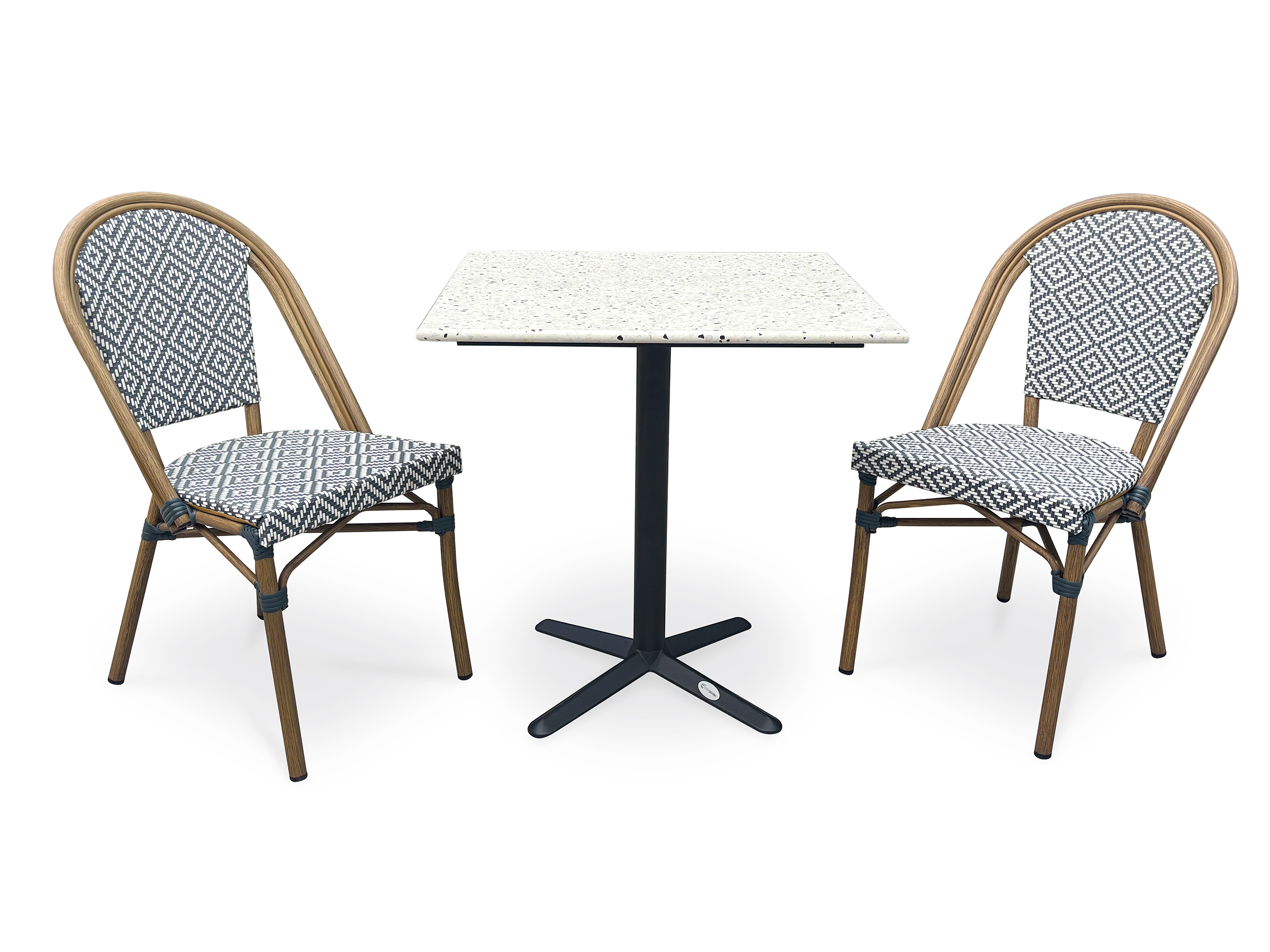 Ensemble repas de jardin BISTRO composé d'une table carrée en acier noir et plateau terrazzo, et de 2 fauteuils de jardin empilables, en aluminium effet bois et textilène de couleur bleu et blanc.