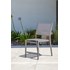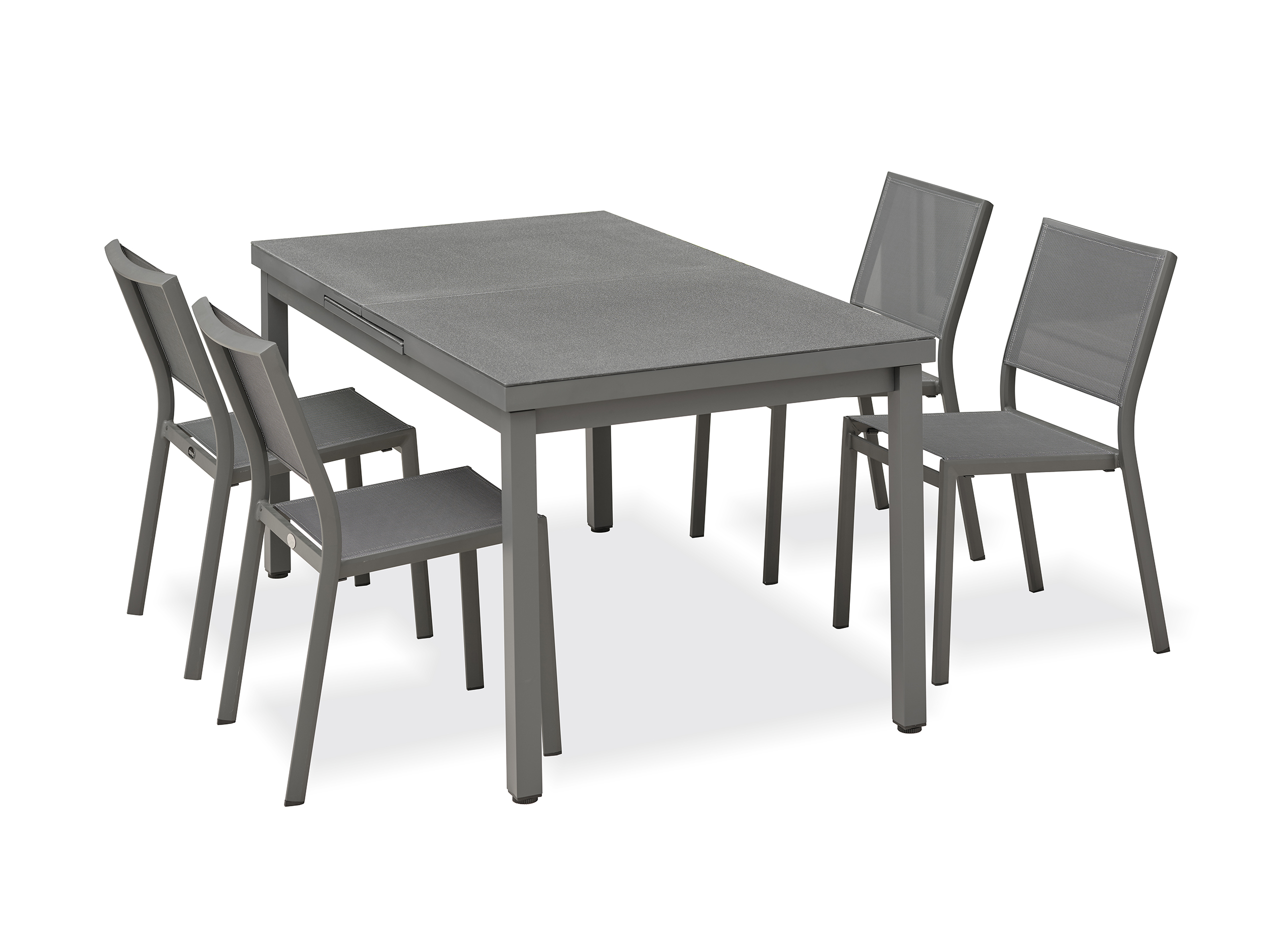 Ensemble repas de jardin DANIA 4 places composé d'une table en aluminium gris anthracite avec plateau en spraystone et rallonge automatique et de 4 chaises empilables en textilène et aluminium gris anthracite. Table équipée d'une rallonge automatique.
