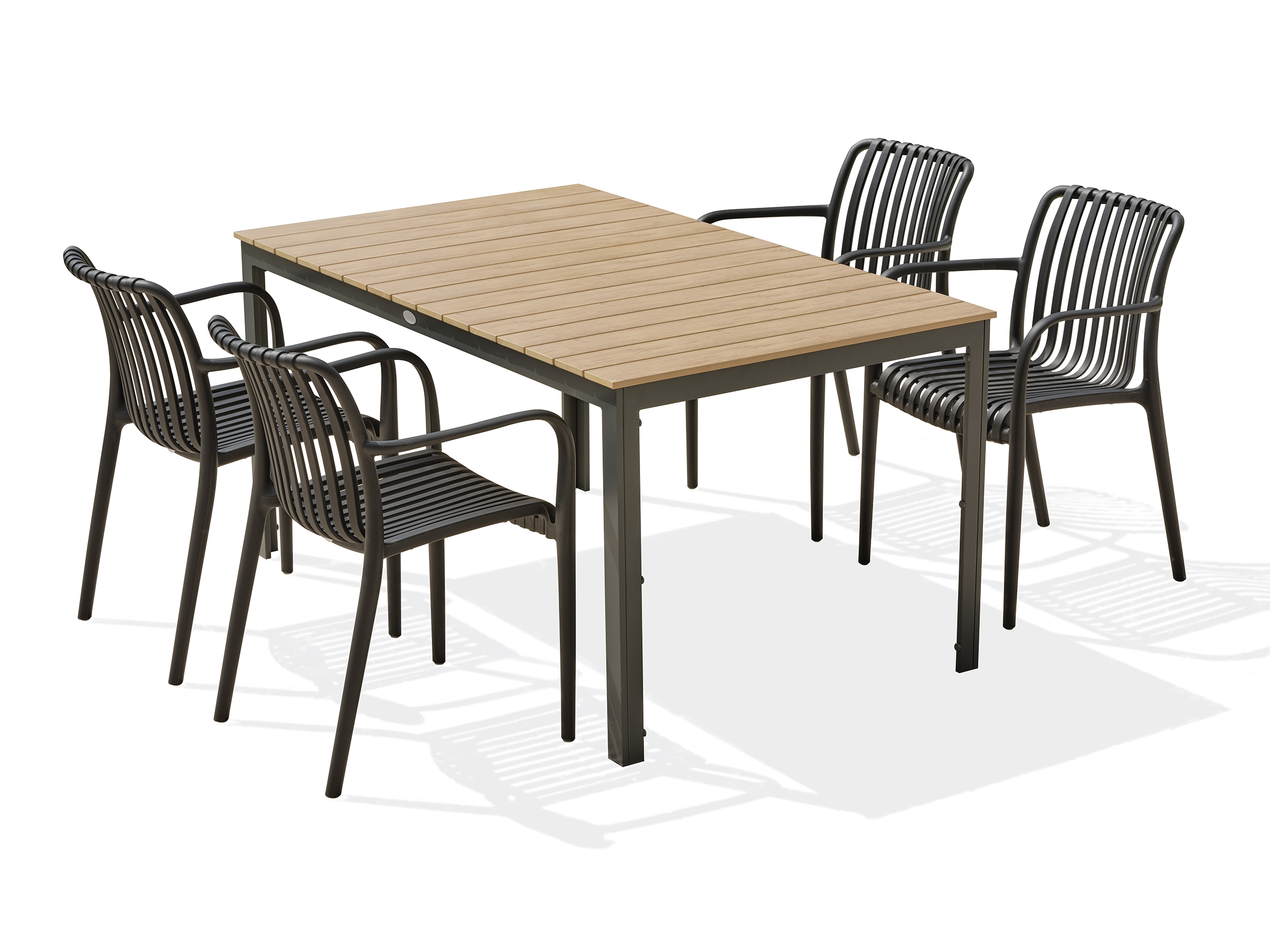 Ensemble repas BOSTON composé d'une table en aluminium gris anthracite avec plateau en polywood imitation bois et de 4 fauteuils de jardin empilables en polypropylène.