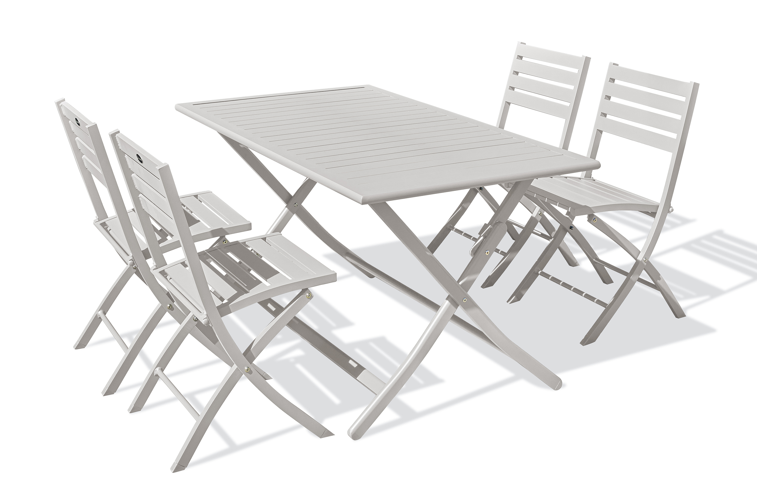 Table de jardin pliante MARIUS en aluminium composé d'une table de jardin pliante et de 4 chaises de jardin pliantes.
