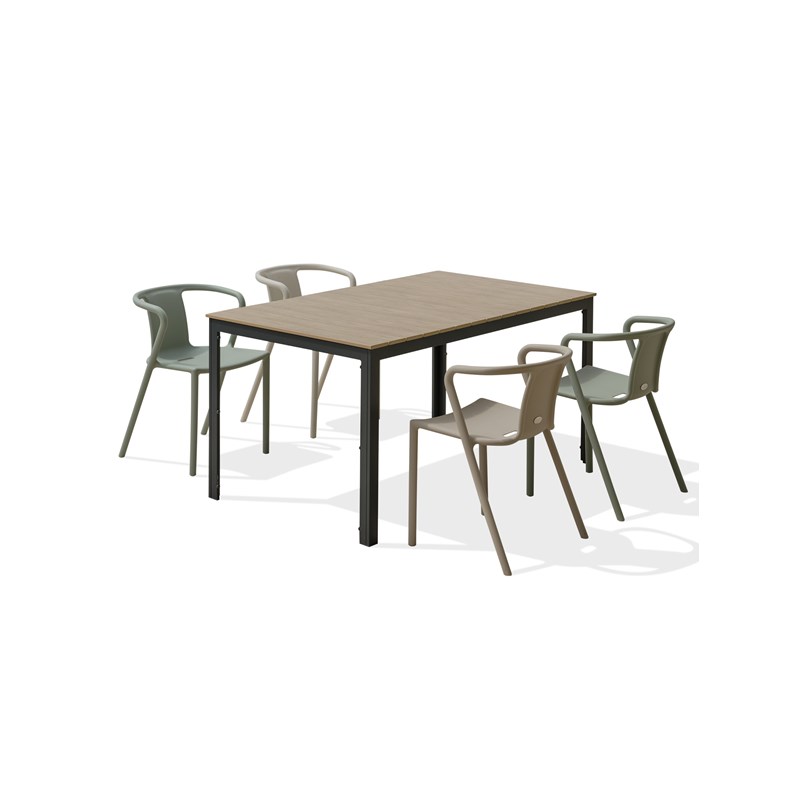 Ensemble repas BOSTON composé d'une table en aluminium gris anthracite avec plateau en polywood imitation bois et de 4 fauteuils de jardin empilables en polypropylène.