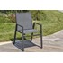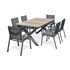 Ensemble repas FLORIDE composé d'une table en aluminium avec ralonge automatique avec plateau HPL imitation bois et fauteuils empilables en aluminium et textilène.