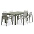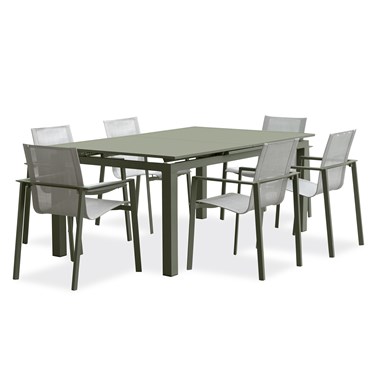 Ensemble repas MIAMI en aluminium composé d'une table avec rallonge automatique et de 6 fauteuils empilables en toile plastifiée et structure aluminium.