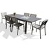 Ensemble repas STOCKHOLM composé d'une table en aluminium gris anthracite, de 4 chaises empilables et de 2 fauteuils empilables en toile plastifiée et structure en aluminium gris anthracite. Table équipée d'une rallonge manuelle.
