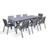 Ensemble repas FLORIDE composé d'une table en aluminium avec rallonge et plateau en céramique sur verre et de fauteuils empilables en aluminium et textilène.