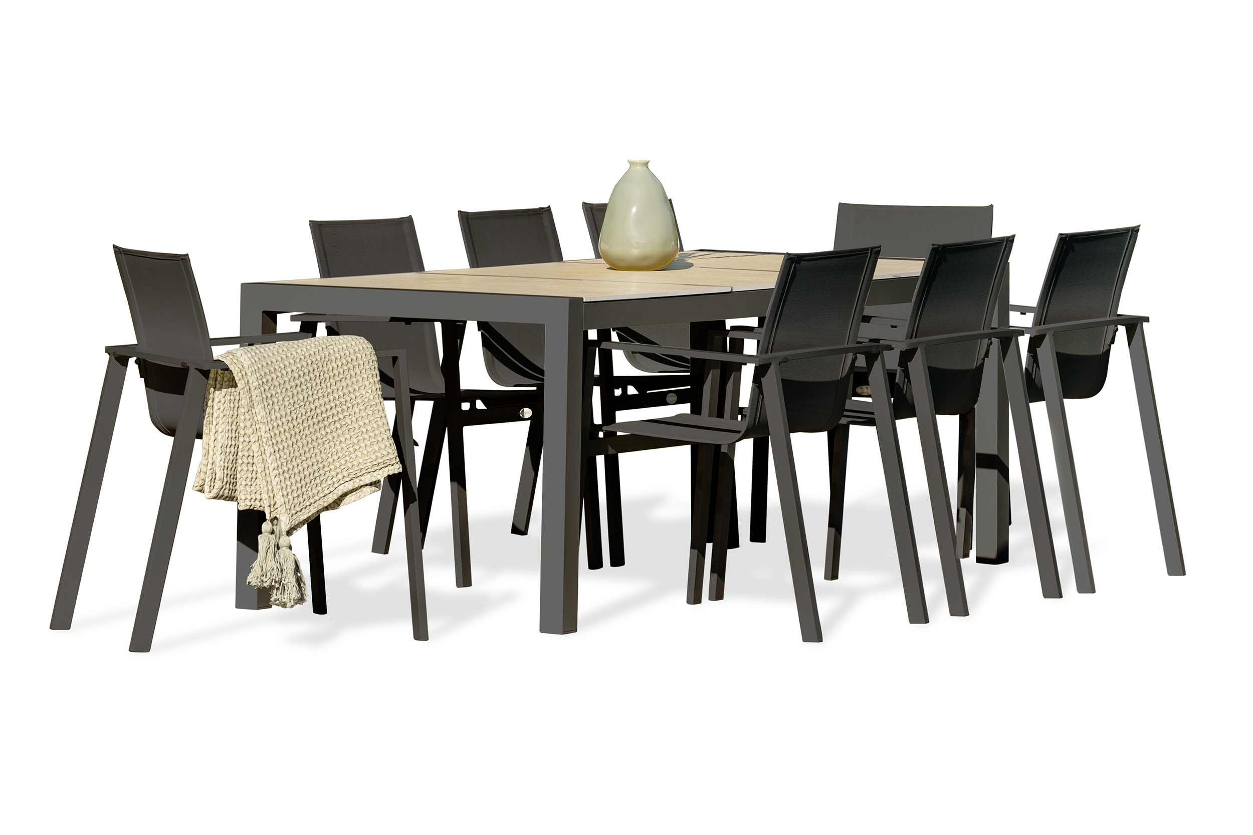 Ensemble repas VENISE composé d'une table fixe en aluminium gris anthracite avec plateau céramique beige aspect pierre naturelle et de 8 fauteuils en aluminium et toile plastifiée.
