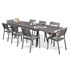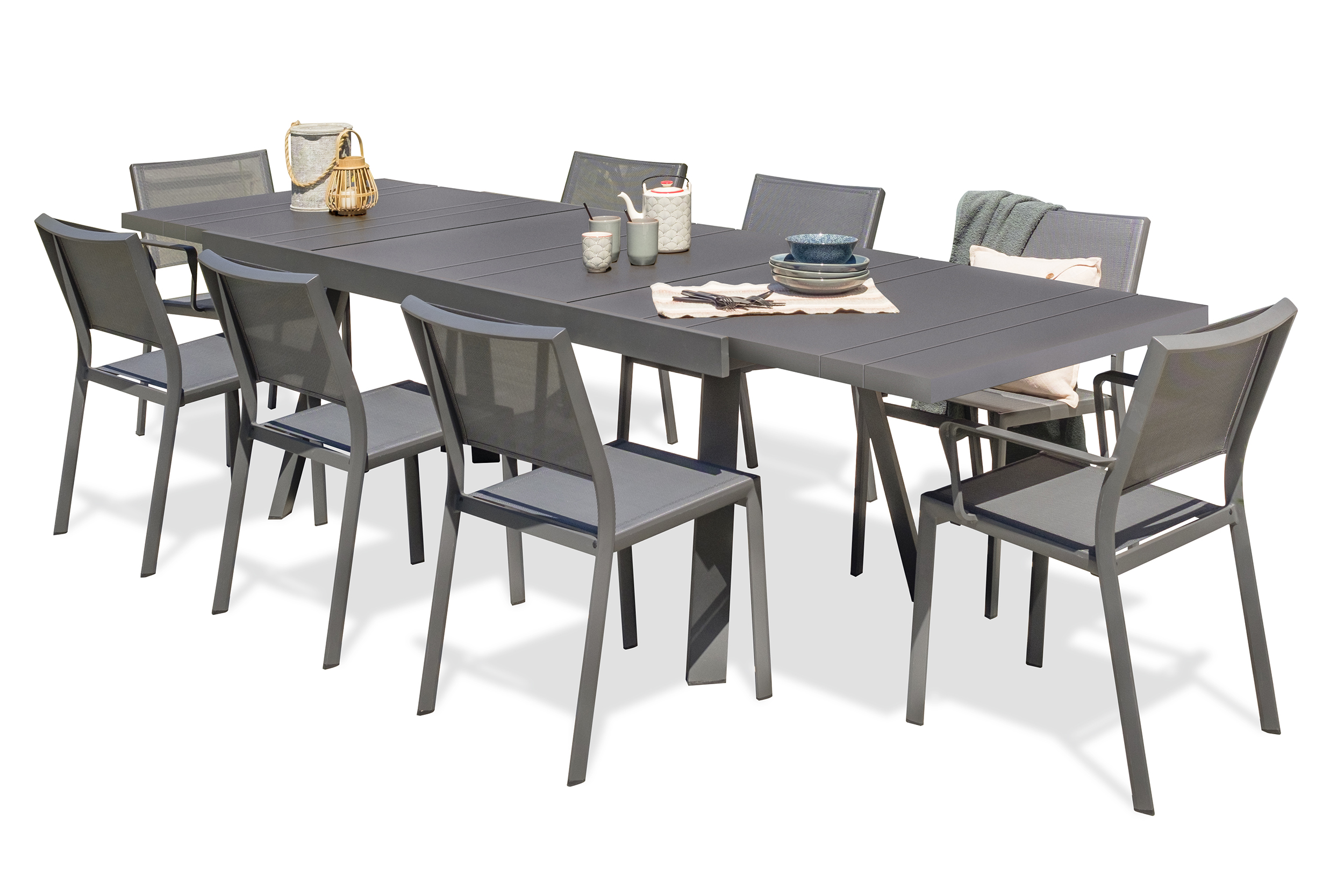 Ensemble repas STOCKHOLM composé d'une table en aluminium gris anthracite, de 6 chaises empilables et de 2 fauteuils empilables en toile plastifiée et structure en aluminium gris anthracite. Table équipée d'une rallonge manuelle.