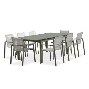 Ensemble repas MIAMI en aluminium composé d'une table avec rallonge automatique et de 8 fauteuils empilables en toile plastifiée et structure aluminium.