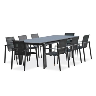 Ensemble repas ALU-MIAMI en aluminium gris anthracite composé d'une table à rallonge automatique et de 8 fauteuils empilables en aluminium gris anthracite et toile plastifiée noir