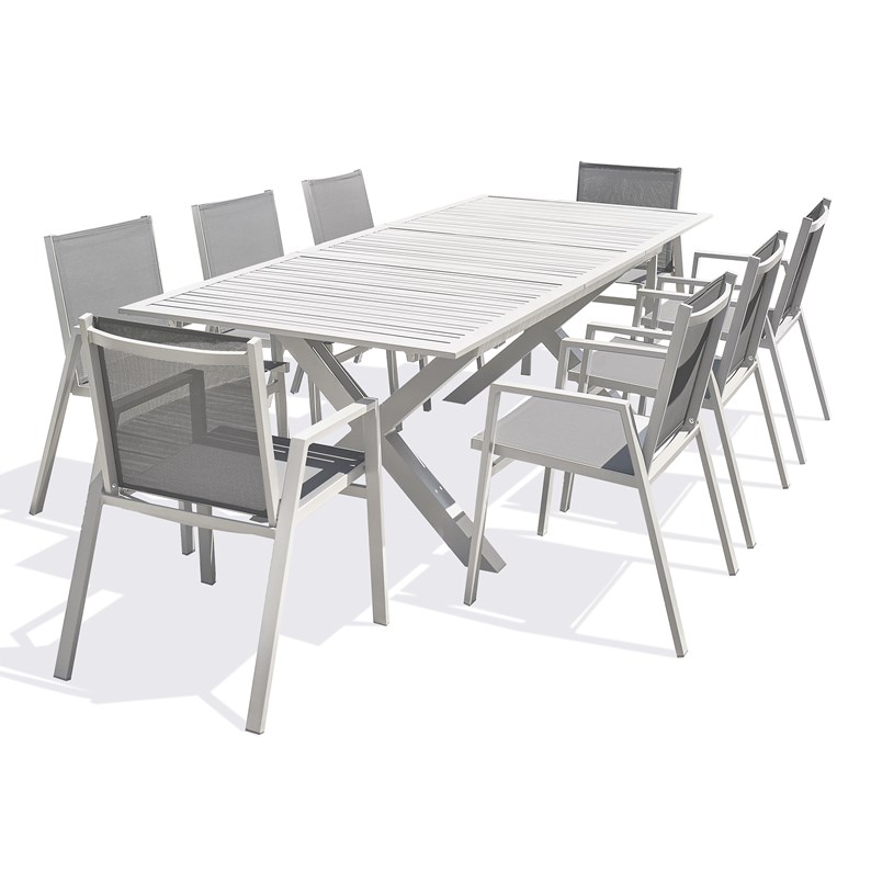 Ensemble repas FLORIDE composé d'une table en aluminium avec rallonge automatique et de fauteuils empilables en aluminium et textilène.