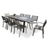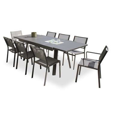 Ensemble repas STOCKHOLM composé d'une table en aluminium gris anthracite, de 4 chaises empilables et de 2 fauteuils empilables en toile plastifiée et structure en aluminium gris anthracite. Table équipée d'une rallonge manuelle.