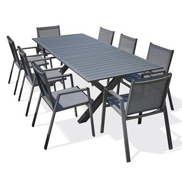 Ensemble repas FLORIDE composé d'une table en aluminium avec rallonge automatique et de fauteuils empilables en aluminium et textilène.