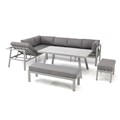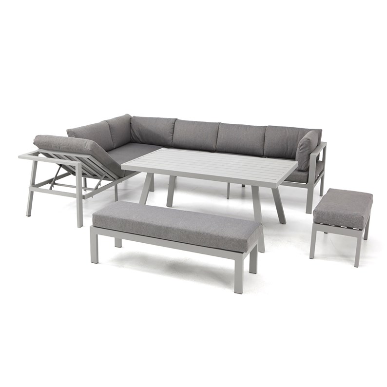 Salon de jardin ANTALYA 9 places en aluminium, composé de 1 table, 1 canapé 3 pl avec assise réhaussable, 1 méridienne, 1 banc 2 pl, 1 banc 1 pl. Coussins déhoussables 250 g/m² garni polyester (20kg/m3).