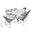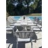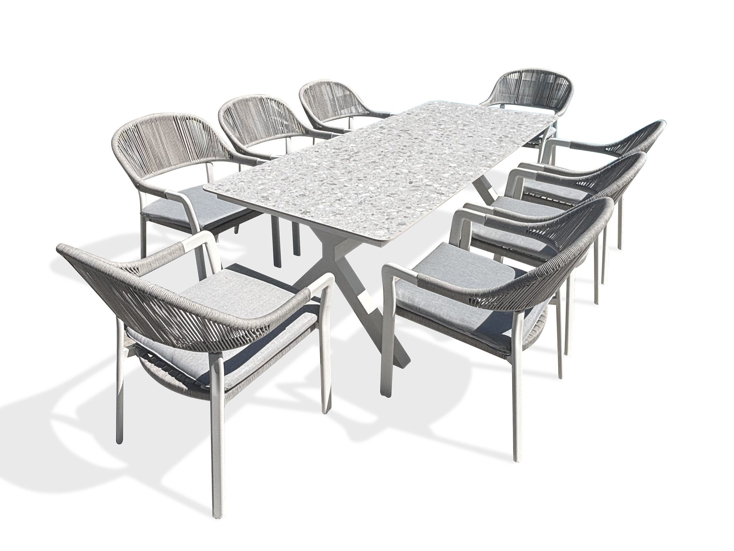 Les pieds en croix de coloris blanc apportent légèreté et équilibre à la table de jardin rectangulaire ABELLA. Ils se coordonnent harmonieusement aux détails du plateau effet Terrazzo dont les contrastes sont élégants et les teintes modernes.