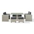 Ensemble repas encastrable OCEANE-LUNCH en résine tressée crème et structure alu, composé d'une table avec plateau verre et empiètement pour parasol, 2 canapés 2 pl, 4 poufs. Coussins déhoussables 100% polyester écru. Housse de protection vendue séparement.