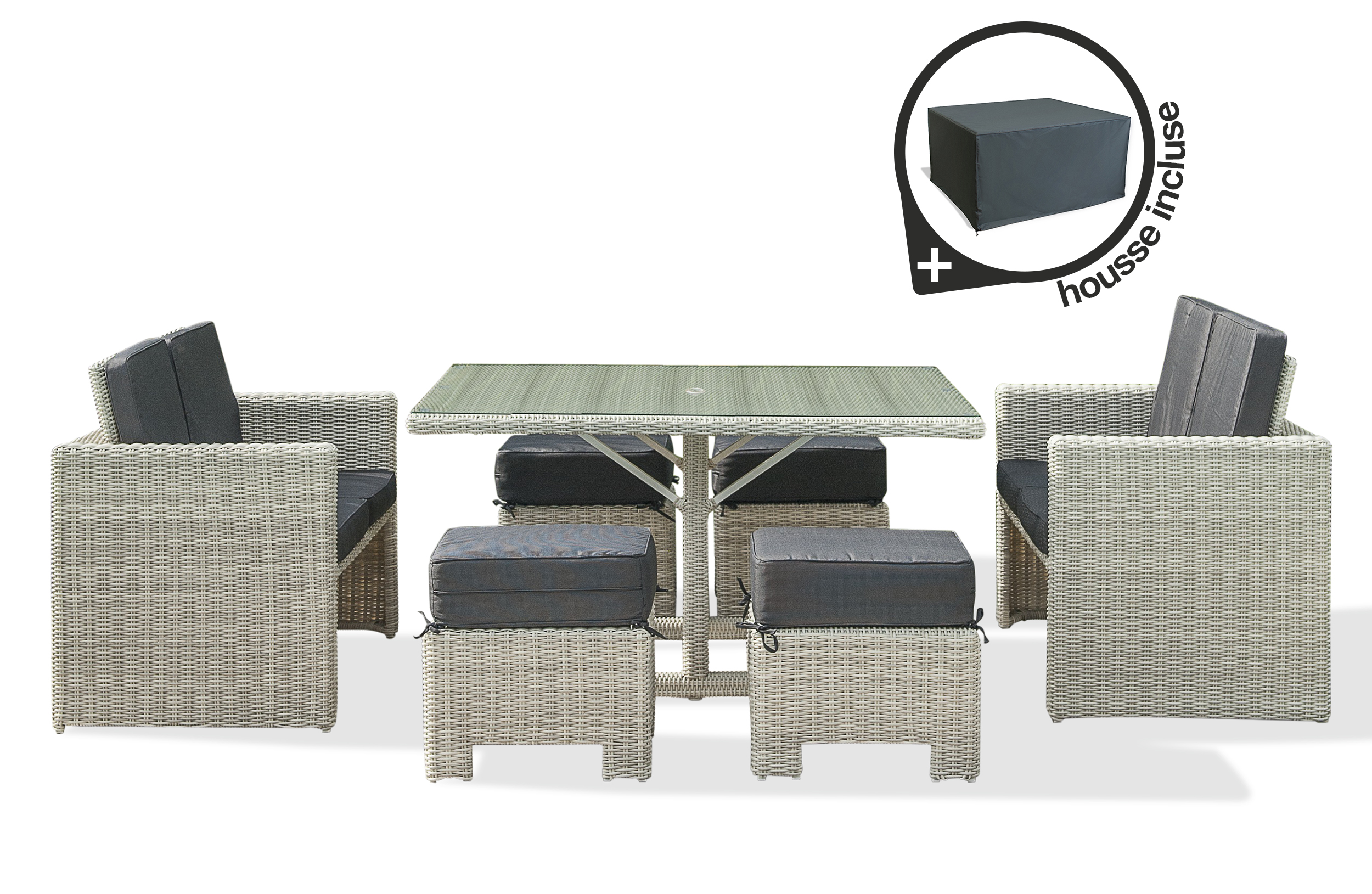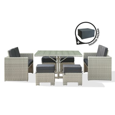 Ensemble repas encastrable 8 places en résine tressée crème + housse