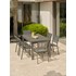 Ensemble repas de jardin DANIA 6 places composé d'une table en aluminium gris anthracite avec plateau en spraystone et de 4 chaises empilables et de 2 fauteuils empilables en textilène et aluminium gris anthracite. Table équipée d'une rallonge automatique.
