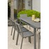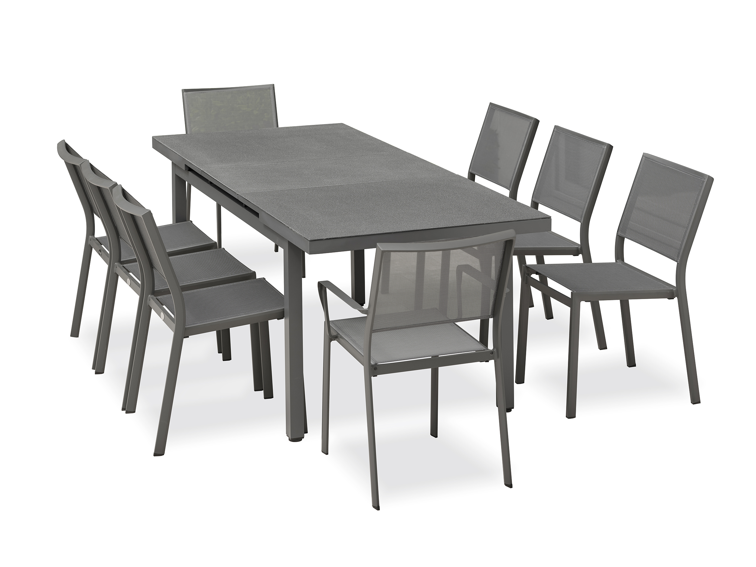 Ensemble repas de jardin DANIA 8 places composé d'une table en aluminium gris anthracite avec plateau en spraystone et de 6 chaises empilables et de 2 fauteuils empilables en textilène et aluminium gris anthracite. Table équipée d'une rallonge automatique.