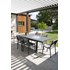 Ensemble repas STOCKHOLM composé d'une table en aluminium gris anthracite, de 4 chaises empilables et de 2 fauteuils empilables en toile plastifiée et structure en aluminium gris anthracite. Table équipée d'une rallonge manuelle.