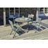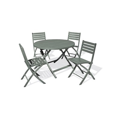 Table de jardin pliante MARIUS en aluminium composé d'une table ronde pliante et de 4 chaises de jardin pliantes.