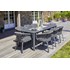 Ensemble repas CAMARGUE composé d'une table en aluminium gris anthracite et plateau céramique sur verre et de 8 fauteuils empilables en corde gris anthracite et structure aluminium gris anthracite. Coussins déhoussables en toile 100% polyester gris anthracite.