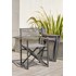 Ensemble repas HONFLEUR composé d'une table en aluminium avec plateau verre et rallonge HPL et de 8 fauteuils pliants en toile plastifiée, structure aluminium et accoudoirs HPL.