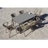 Ensemble repas MEET composé d'une table en aluminium avec peinture Epoxy, plateau en stratifié compact de haute densité, et de 6 fauteuils FADO empilables en Polypropylène renforcé avec fibre de verre, 100% recyclables, embouts antidérapants.