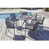 Ensemble repas PILAT composé d'une table ronde fixe en alu anthracite et plateau HPL effet pierre et de 6 fauteuils empilables en corde grise et structure anthracite. Table avec pieds croisés. Coussins déhoussables en toile 100% polyester gris clair.