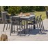 Ensemble repas VENISE en aluminium, composé d'une table à rallonge automatique avec plateau céramique aspect pierre naturelle et de 6 fauteuils empilables en toile plastifiée et structure aluminium.