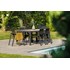Ensemble repas VENISE composé d'une table fixe en aluminium gris anthracite avec plateau céramique beige aspect pierre naturelle et de 6 fauteuils en aluminium et toile plastifiée.