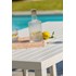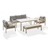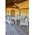 Ensemble repas CAYENNE en aluminium composé d'une table, d'un canapé 3 places, de 2 fauteuils avec accoudoirs en polywood et d'un banc 2 places. Coussins déhoussables en spun polyester.