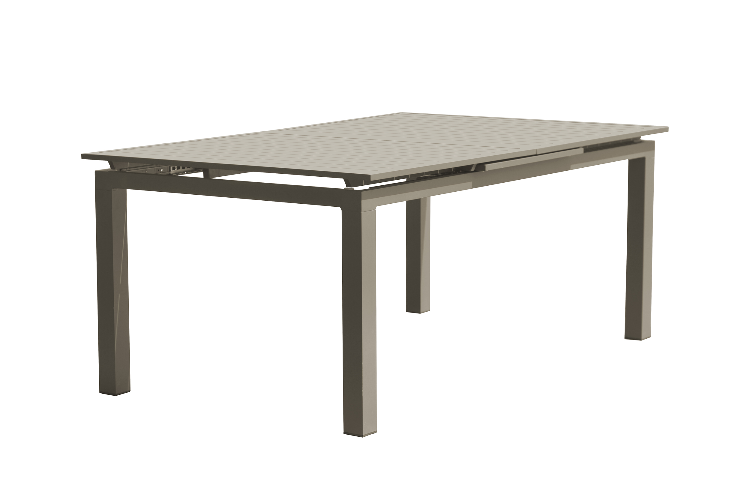 Table de jardin ZAHARA en aluminium avec plateau en lames aluminium, équipée d'une rallonge automatique.