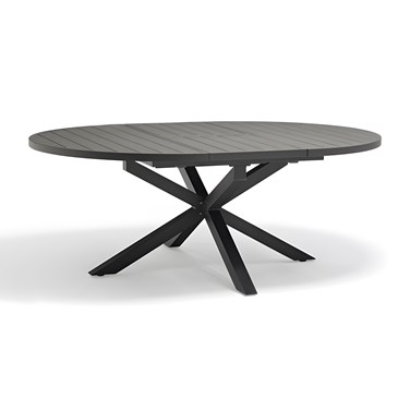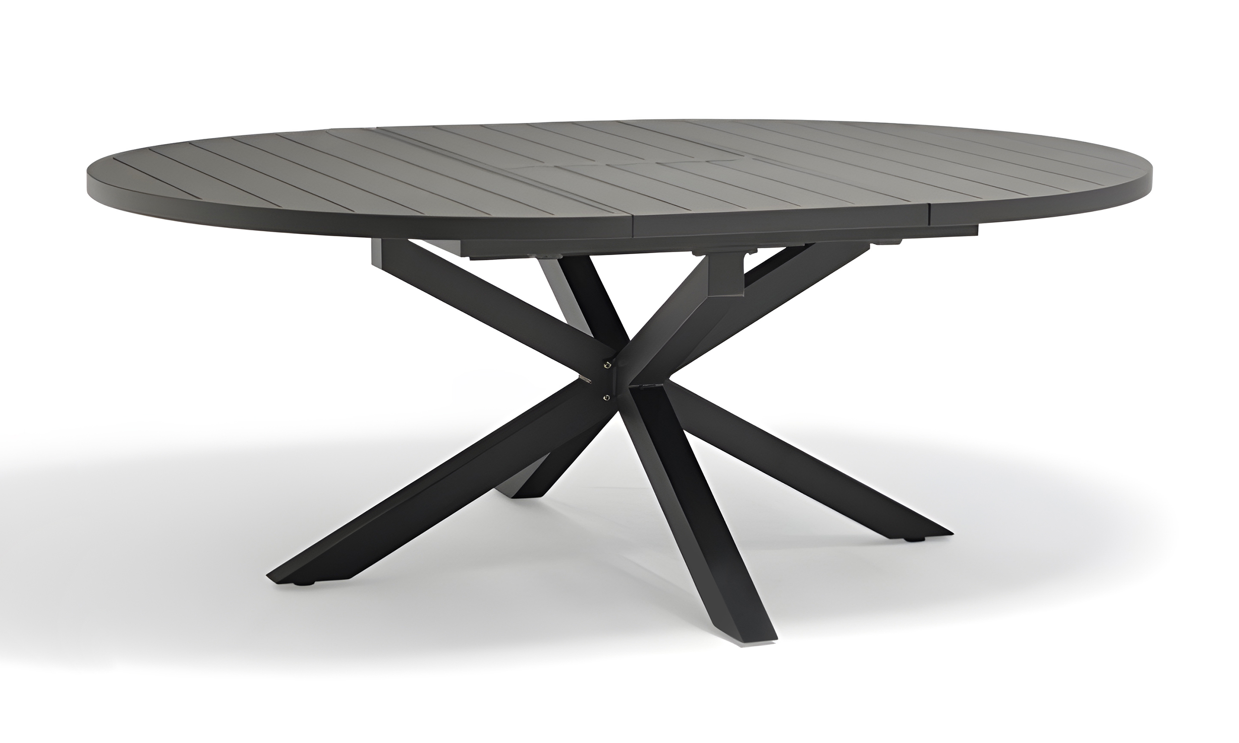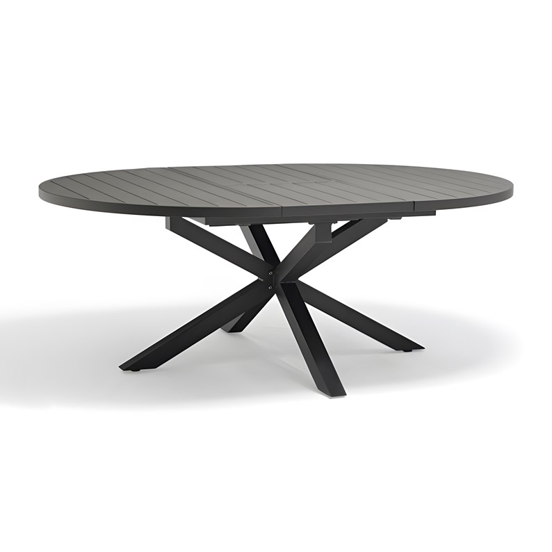 Table de jardin PELOSA en aluminium avec plateau ovale, équipée d'une rallonge papillon.