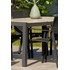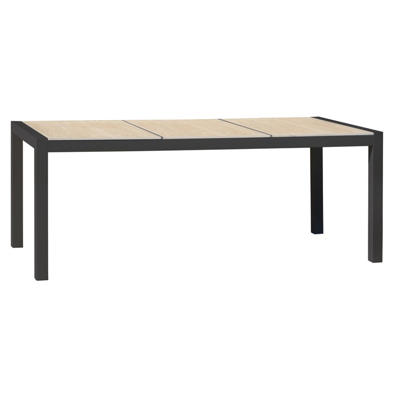 Table de jardin VENISE en aluminium gris anthracite avec plateau fixe en céramique beige motif bois.