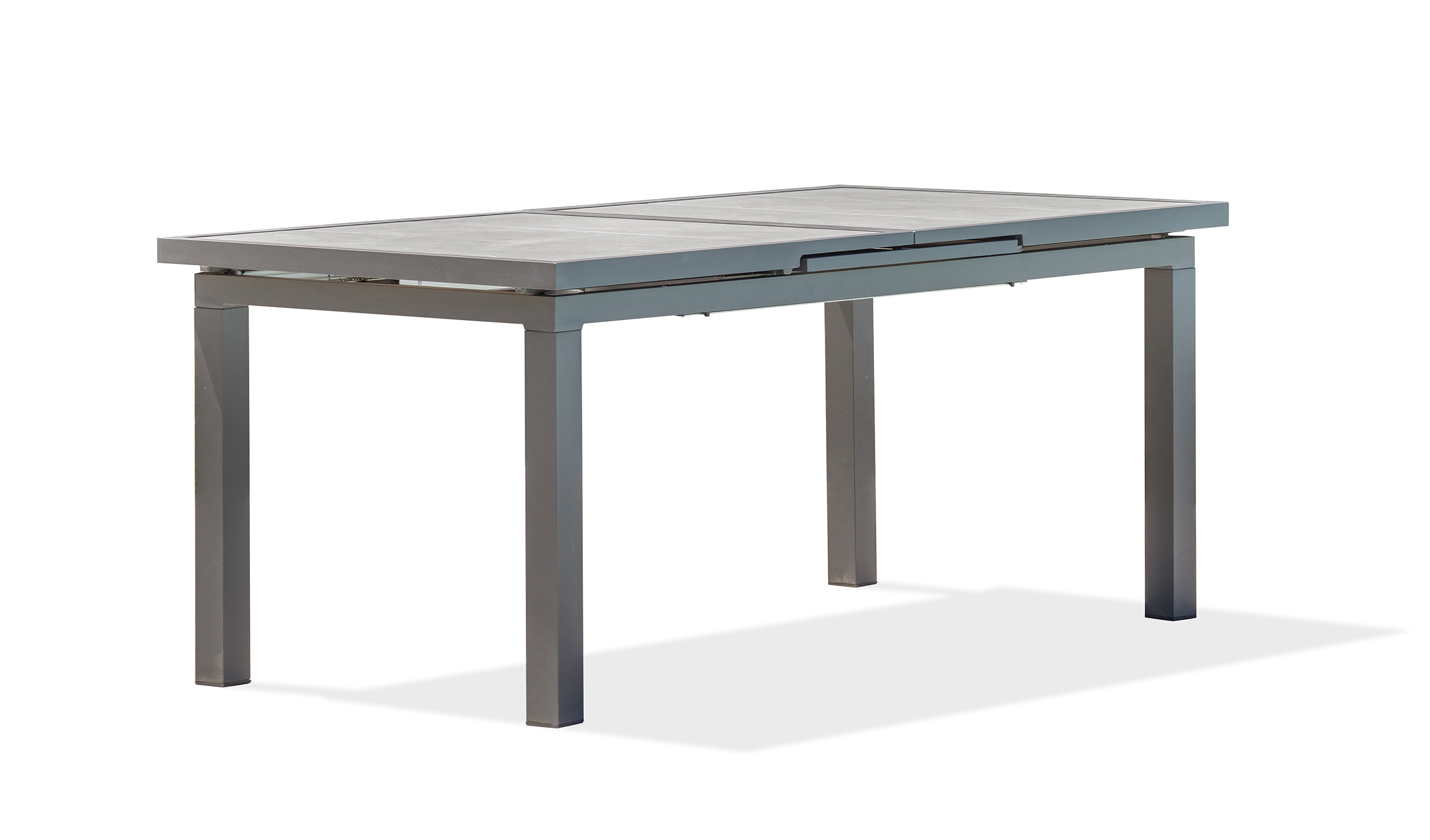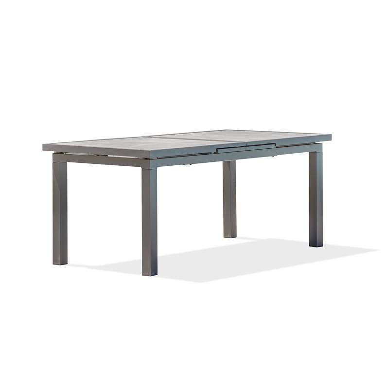 Table de jardin VENISE en aluminium gris anthracite avec plateau céramique aspect pierre naturelle et rallonge automatique.