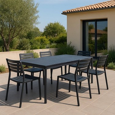 Avec son design moderne et épuré, la table de jardin extensible Kaïa en aluminium gris foncé s'adapte à toutes vos envies. Son plateau de 180 cm peut facilement s'étendre jusqu'à 240 cm, offrant un espace généreux pour accueillir jusqu'à 12 personnes. Son allure élégante et contemporaine en fait un choix parfait pour aménager un extérieur raffiné et convivial.