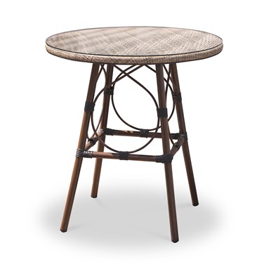 Table de jardin ronde USHUAIA en aluminium marron avec plateau verre et textilène.