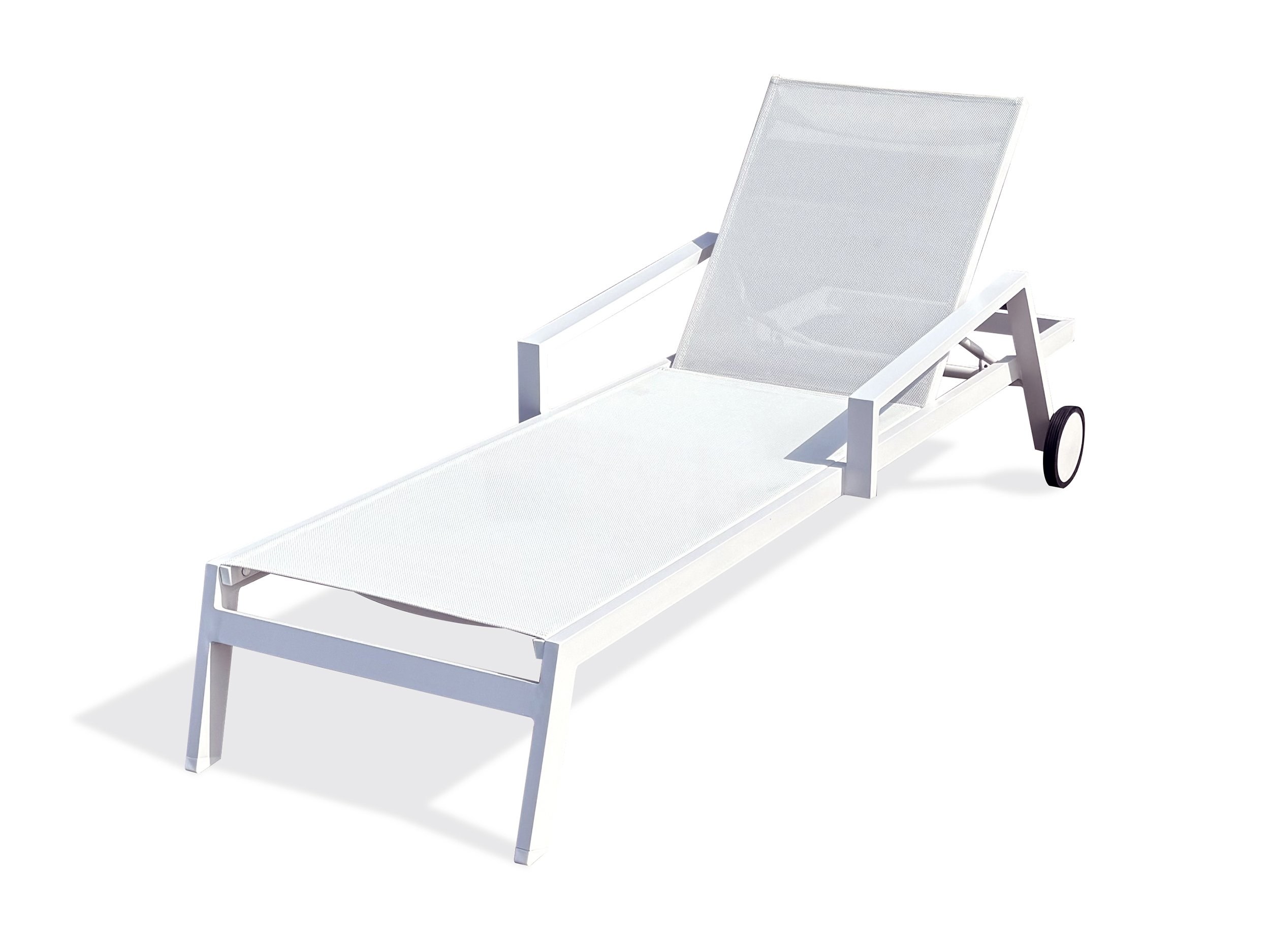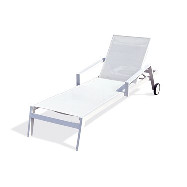 Bain de soleil IBIZA en toile plastifiée avec structure en aluminium. Bain de soleil à roulette avec accoudoirs et dossier réglable 5 positions.