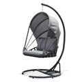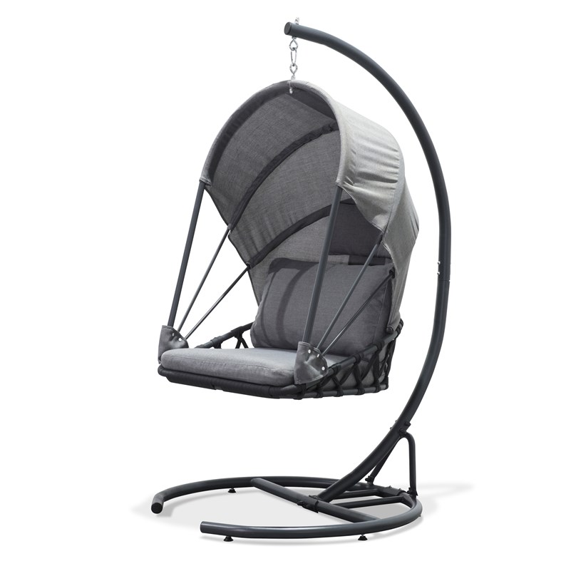 Siège suspendu de jardin LACANAU en tissu et structure acier, assise en corde tissée. Nacelle pliable. Coussin repose-tète avec fixation par velcro. Coussins déhoussables 250 g/m² garni polyester (20kg/m3).