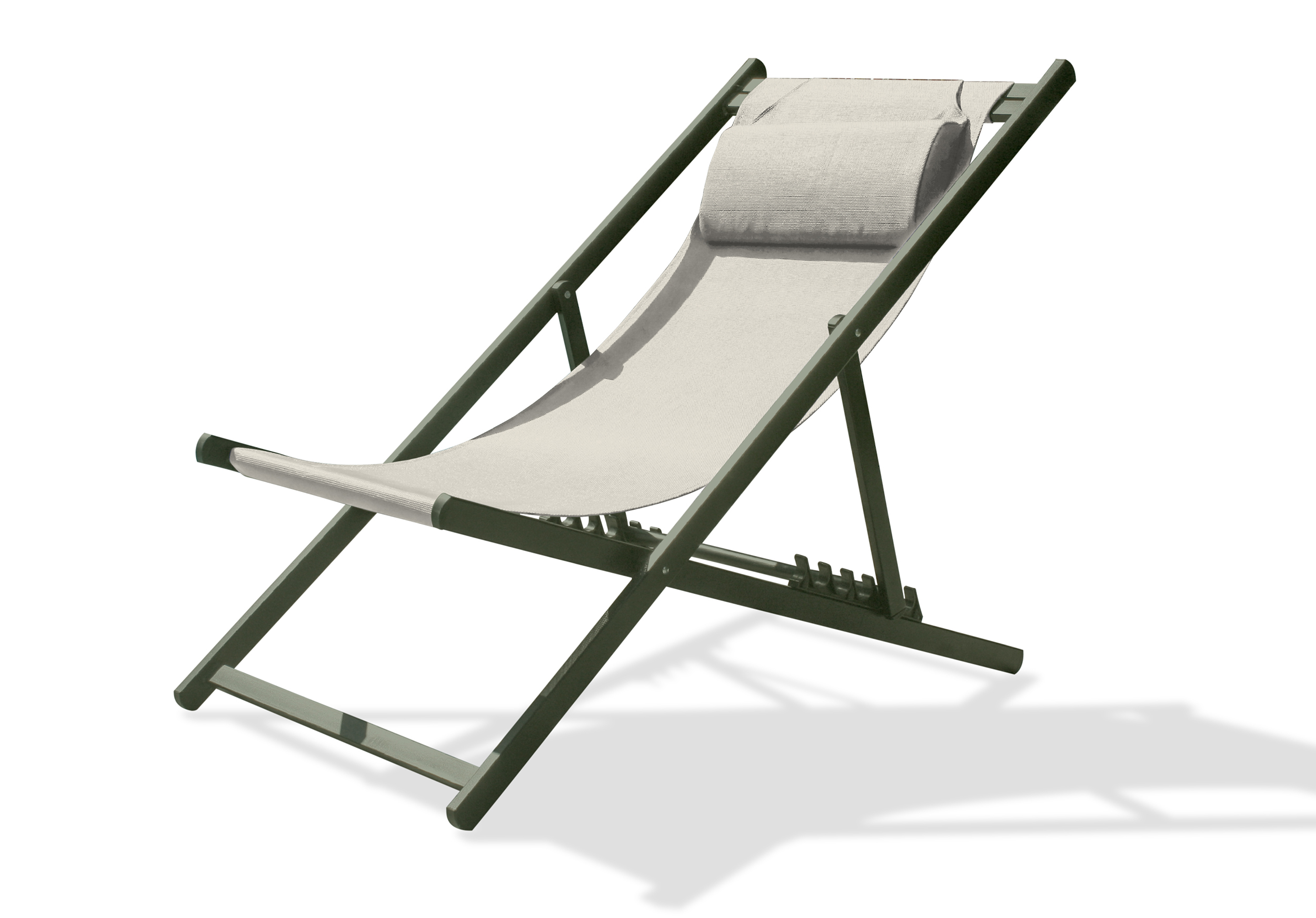 Chilienne de jardin JULIA pliante en toile plastifiée grise et structure aluminium kaki. Coussin repose-tète avec fixation par velcro. Dossier réglable 5 positions.
