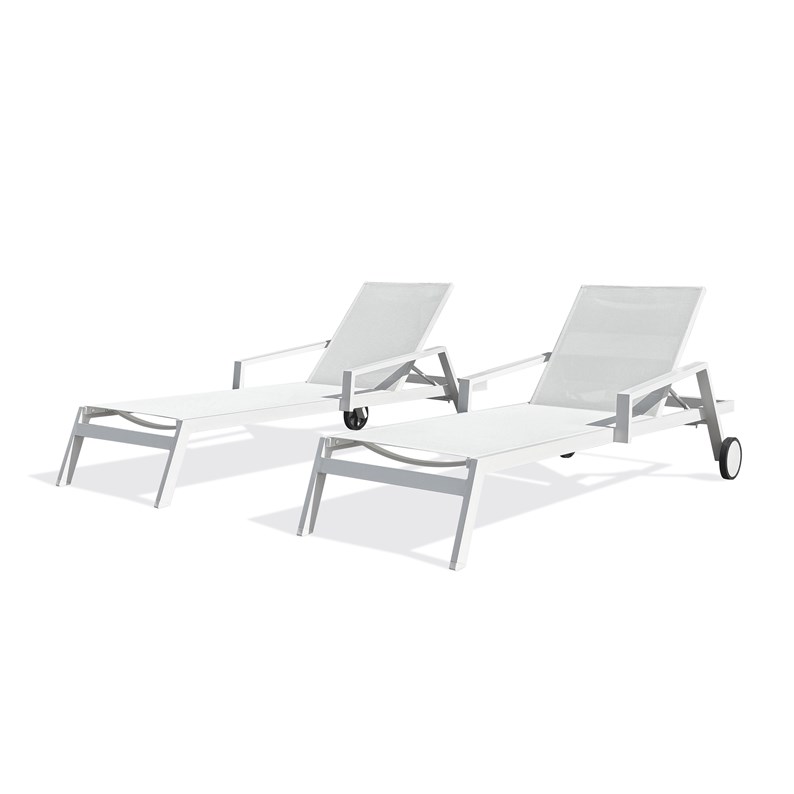 Lots de 2 bains de soleil IBIZA en toile plastifiée avec structure en aluminium. Bains de soleil à roulette avec accoudoirs et dossier réglable 5 positions.