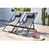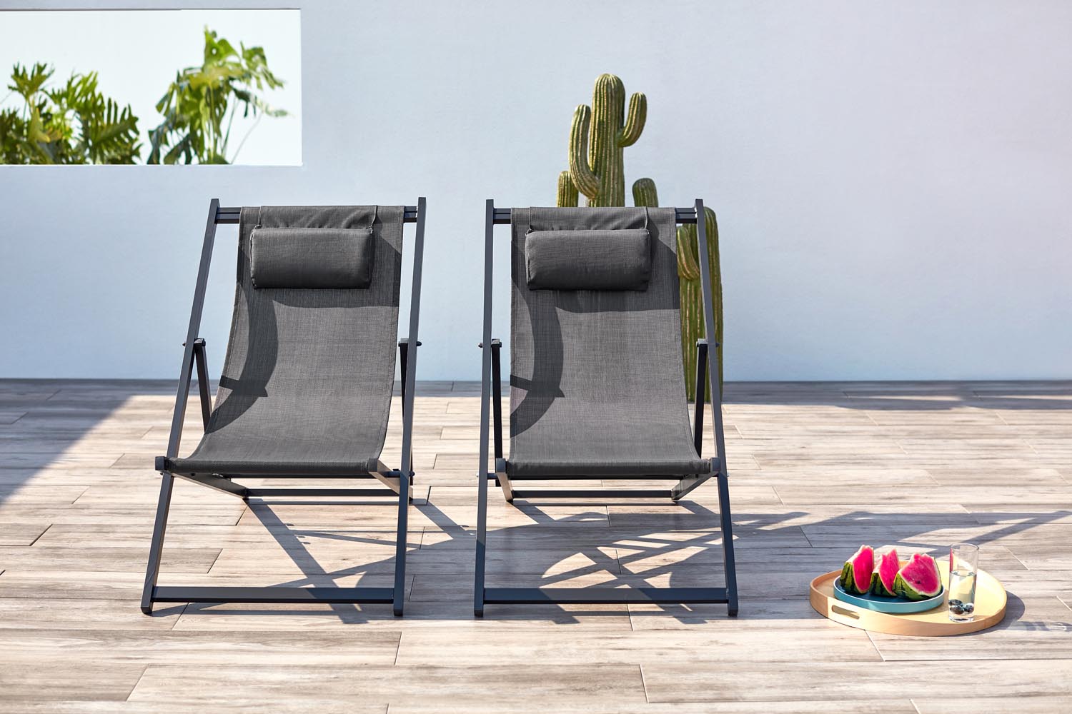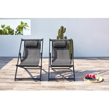 Profitez de pauses ensoleillees cet ete grâce à ce lot de 2 transats confortables ! Inspires du design des chiliennes, ces transats à la structure en aluminium sont très legers, ce qui vous permettra de les deplacer au gre de vos envies dans votre jardin ou sur votre terrasse. Inclinables, vous pourrez choisir la position qui vous convient pour vous detendre au soleil ! Le coussin present au niveau de la tête vous permettra d'être encore mieux installe. Ces transats peuvent egalement se refermer entièrement pour vous faire gagner de l'espace lorsque vous ne les utilisez pas. Leur toile composee de texylène vous promet une assise confortable et une bonne resistance aux intemperies.