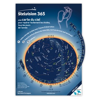 C’est un guide de base pour explorer facilement le ciel : sous un format pratique (dépliant cartonné double-A4), la carte-guide du ciel Stelvision 365 comprend une carte générale du ciel et trois pages de guide vers les principales merveilles célestes.