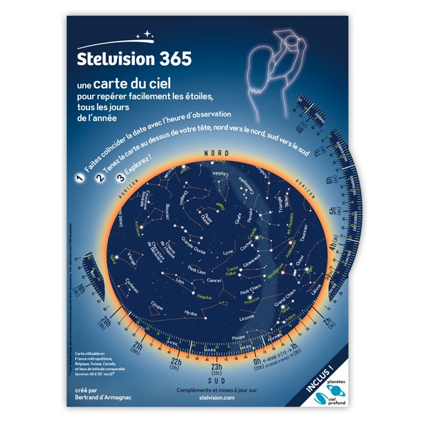 - En couverture, un disque rotatif permet de repérer facilement les étoiles à n’importe quelle date de l’année et à toute heure de la nuit, en France métropolitaine, Belgique, Suisse, Canada et en tout lieu de latitude comparable (entre 40° à 55° de latitude nord environ).