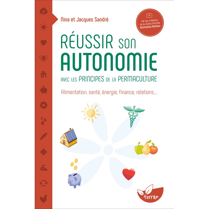 Vous souhaitez développer votre autonomie ? Le guide pratique, simple et inspirant que Nina et Jacques Sandré mettent à votre disposition vous sera d’une grande aide. Partis d’un terrain nu et dégradé et d’une maison classique 100 % électrique en zone pavillonnaire, ils ont fait de l’autonomie le fil rouge de leur vie en s’appuyant sur l’éthique et les principes de la permaculture. Cette démarche, qui consiste à observer la nature afin de reproduire ses modes de fonctionnement, donne des outils puissants et écologiques, applicables à tous les domaines de la vie et adaptables à toutes les situations, pour une cohérence, une efficacité et une résilience maximales. Ce livre vous invite à passer à l’action. Il vous accompagnera au quotidien vers une autonomie aussi complète que possible dans tous les domaines de la vie : alimentation, santé physique et mentale, relation à soi et aux autres, énergie, finance. Des partages d’expériences et de nombreux conseils vous feront gagner du temps et de l’énergie pour atteindre votre objectif. Vous pouvez, vous aussi, mettre en place une vie agréable, qui a du sens et où règnent l’abondance, la bienveillance, la diversité et l’harmonie !