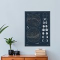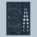 - La carte révèle des informations sur le ciel étoile : elle présente les phases de la lune, les différentes constellations observables depuis l'hémisphère nord et l'hémisphère sud, et elle nomme les objets du ciel profond qu'on peut apercevoir à la nuit tombée.