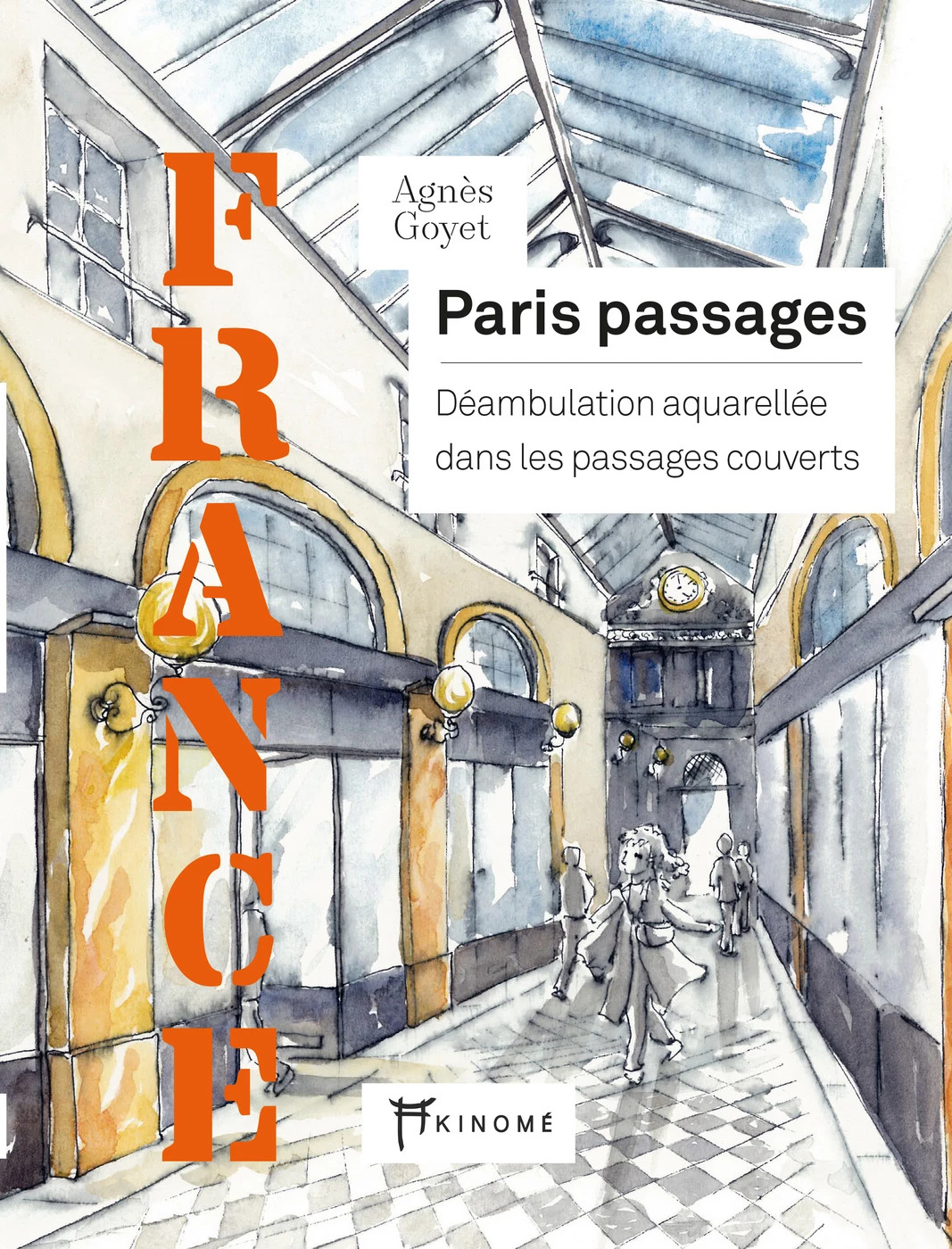 Parisienne et aquarelliste, Agnès Goyet nous entraîne, pinceau à la main, dans une promenade guidée au fil des passages couverts de la capitale. Ces lieux , qui ont connu leur âge d’or au xixe siècle, en conservent parfois l’atmosphère, avec leurs boutiques aux enseignes pittoresques ou leurs devantures au charme désuet. On croit entrer dans un immeuble, et l’on découvre une rue intérieure, une verrière, des escaliers qui mènent vers des trésors cachés… On y croise des artisans qui perpétuent des métiers anciens, mais aussi des coiffeurs africains ou des vendeurs d’épices, qui nous font voyager sans quitter Paris