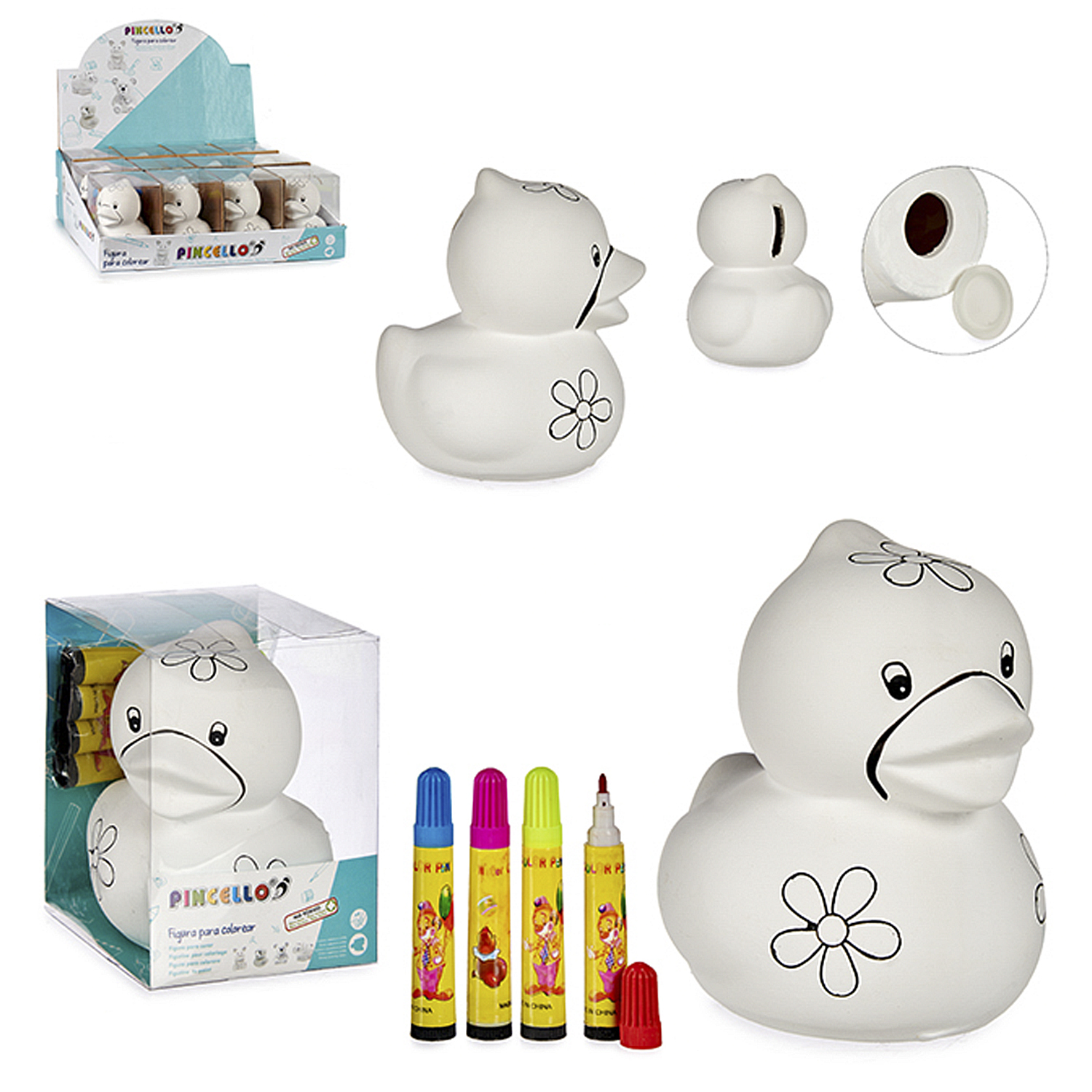 Tirelire à peindre motif canard : • Tirelire amusante pour laisser libre cours à votre imagination et créer des décorations uniques. • Comprend 4 marqueurs de couleur. • Créez des designs uniques et entièrement personnalisés.
