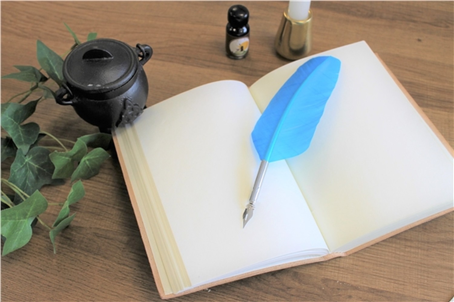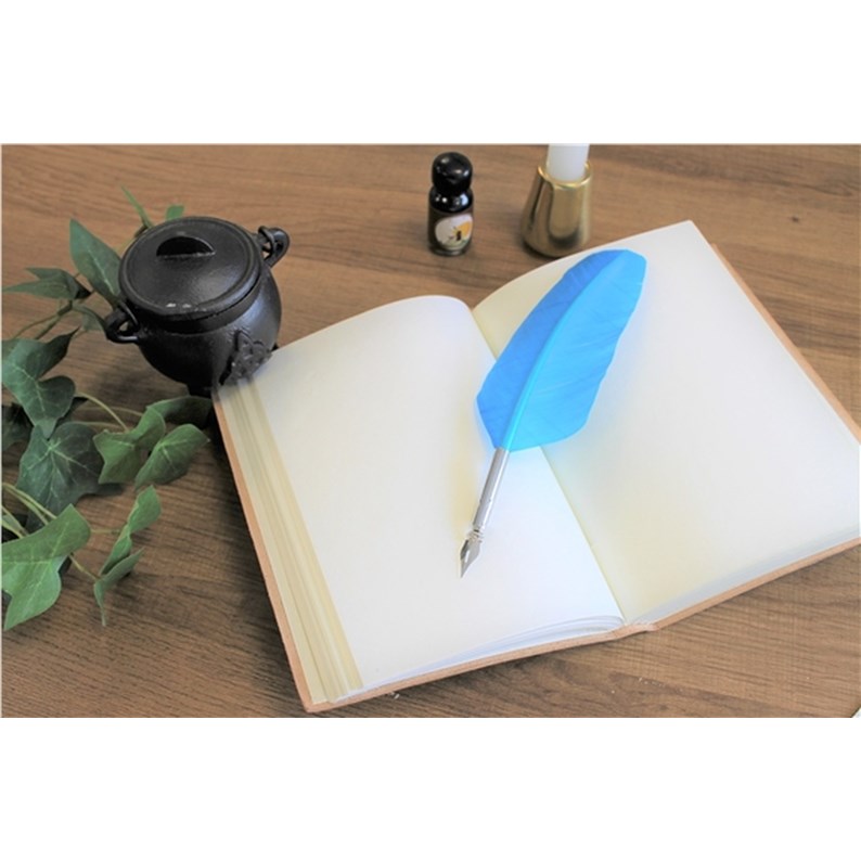 Coffret composé d'un stylo plume bleu clair, d'1 pointe d'écriture en laiton et d'un flacon d'encre. Elégamment coiffé d'une plume bleue, ce stylo plume est fin et léger pour garantir une bonne prise en main. L'encre noire, formulée avec soin et dans le respect de l'environnement, permettra de laisser une belle trace dans les carnets et grimoires de magie.